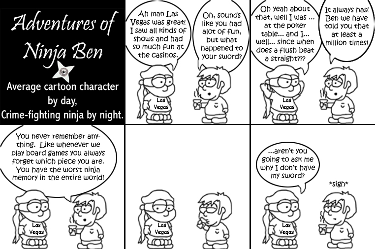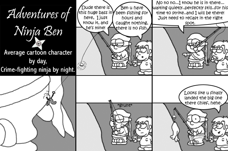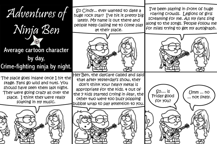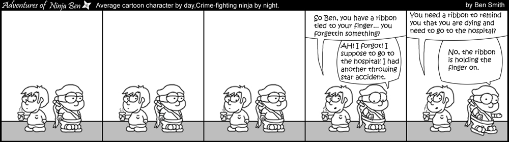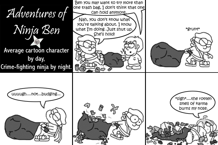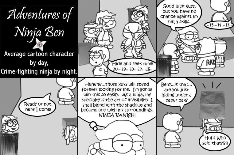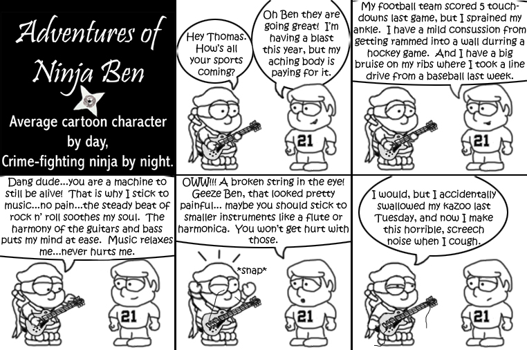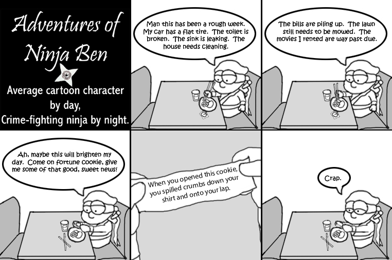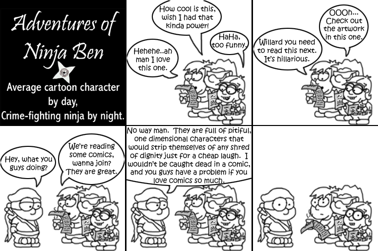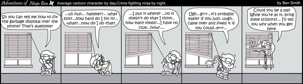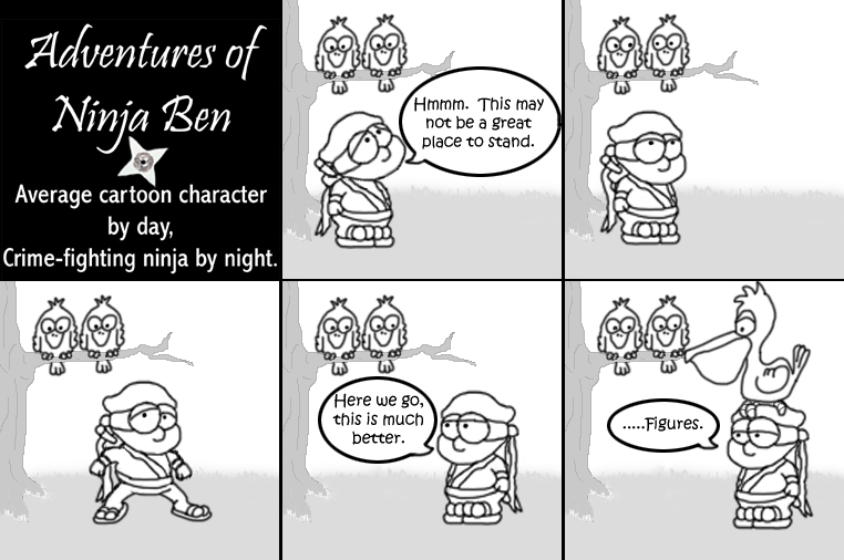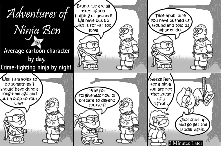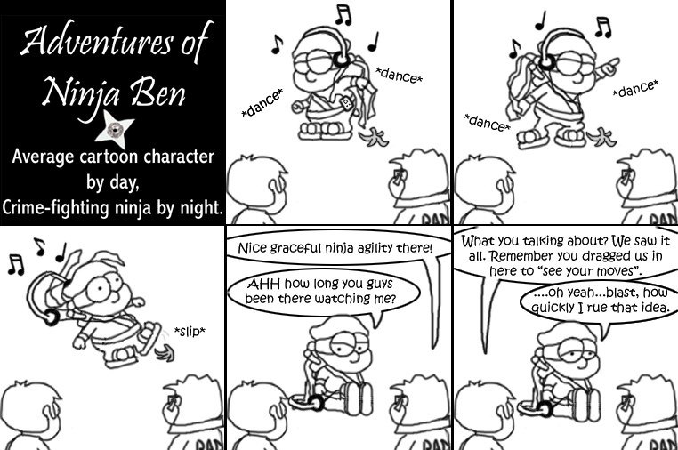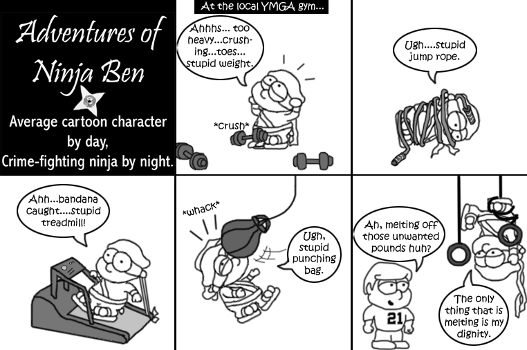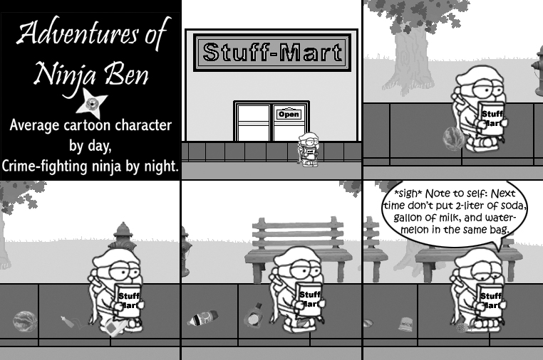 I used to write/illustrate a weekly comic strip for a small newspaper. NinjaBen was my alter ego who does everyday normal things... ...just in a ninja outfit. |