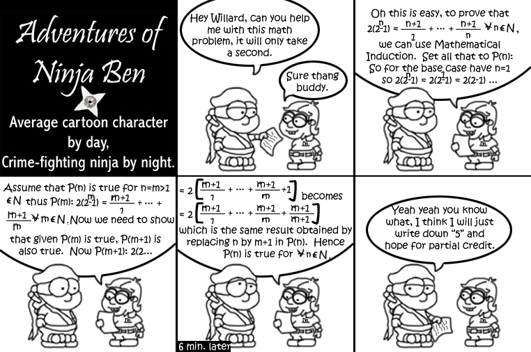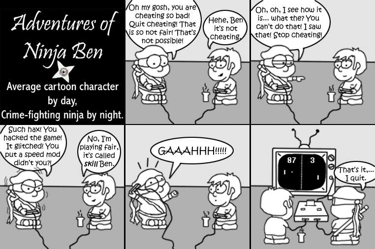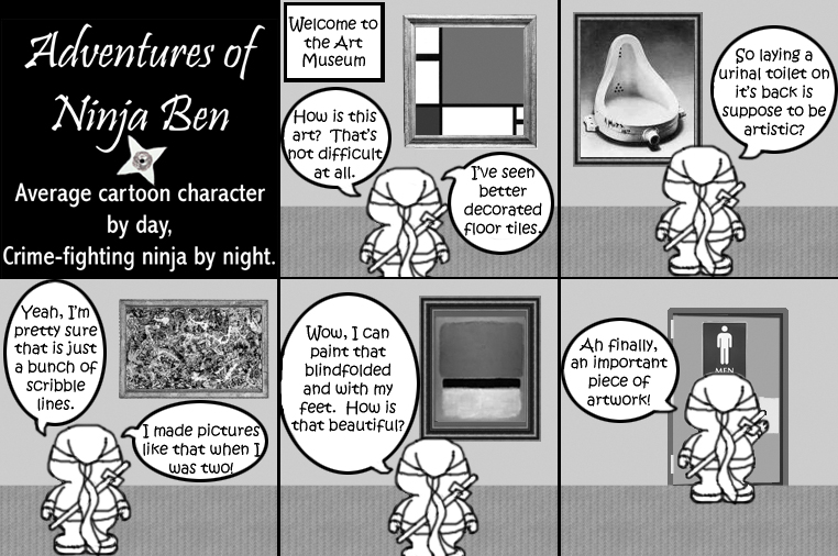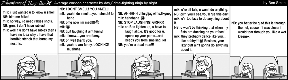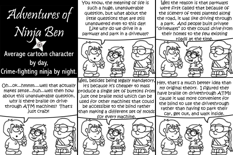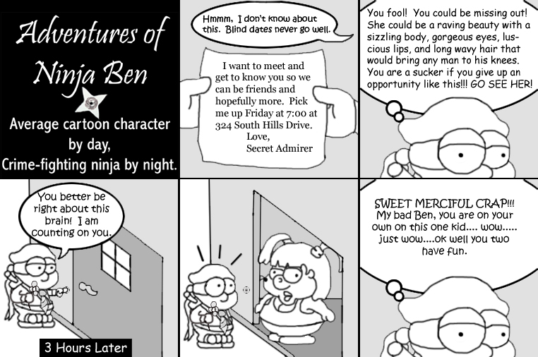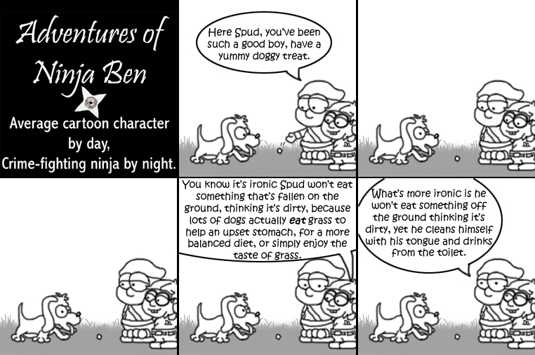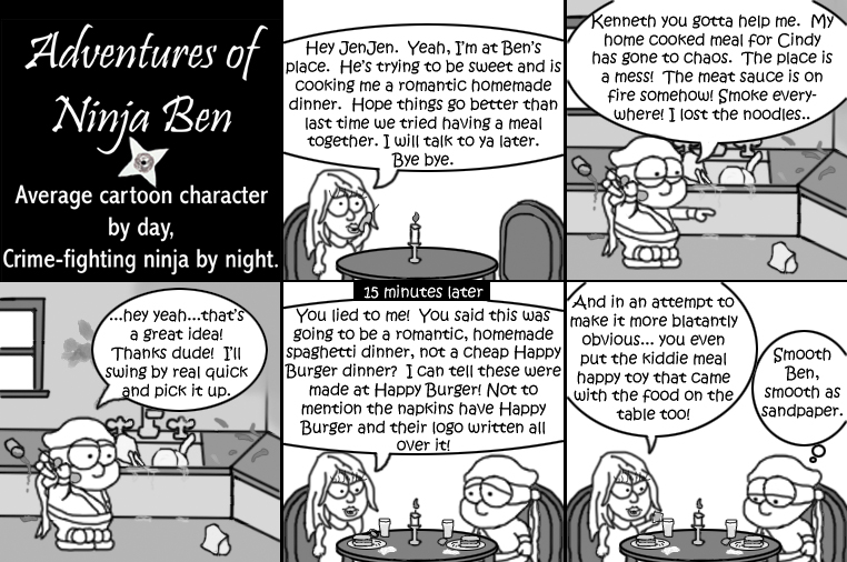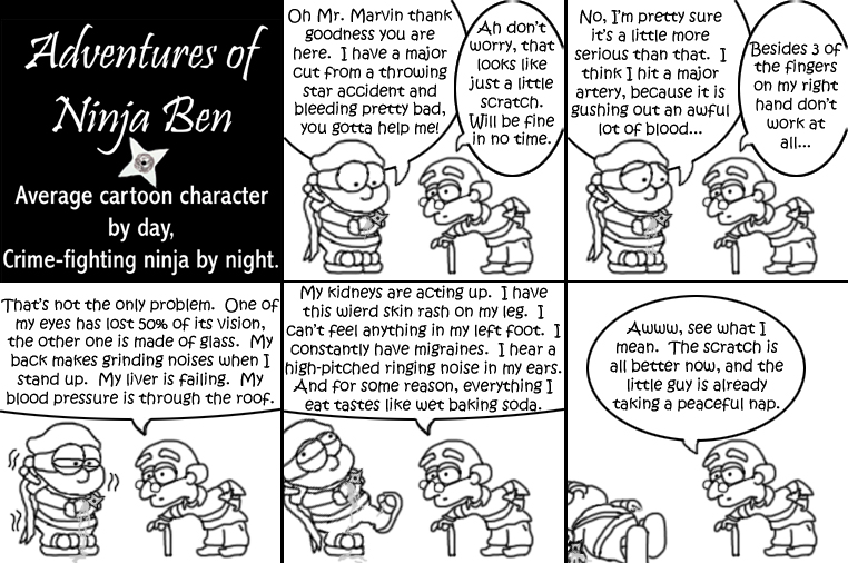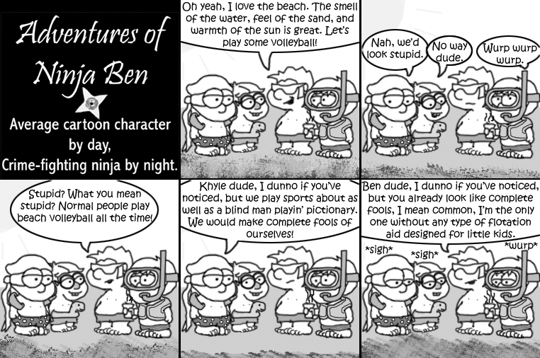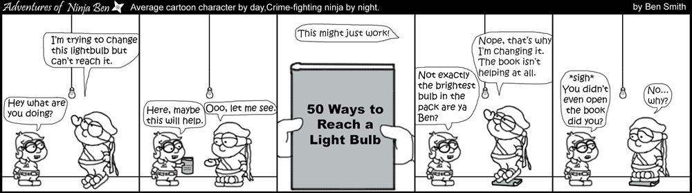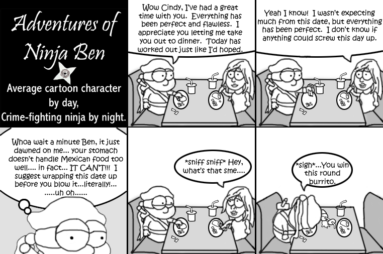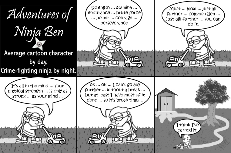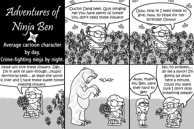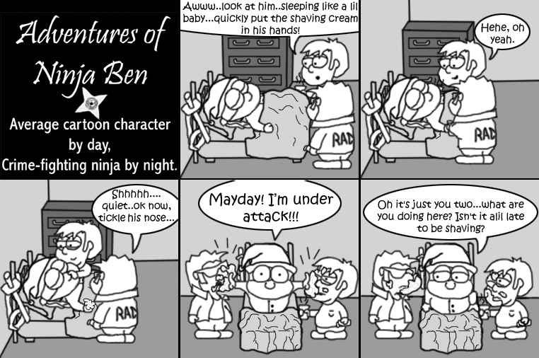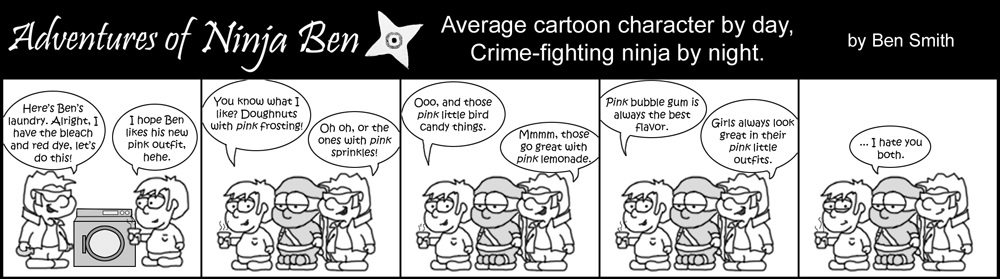 I used to write/illustrate a weekly comic strip for a small newspaper. NinjaBen was my alter ego who does everyday normal things... ...just in a ninja outfit. |